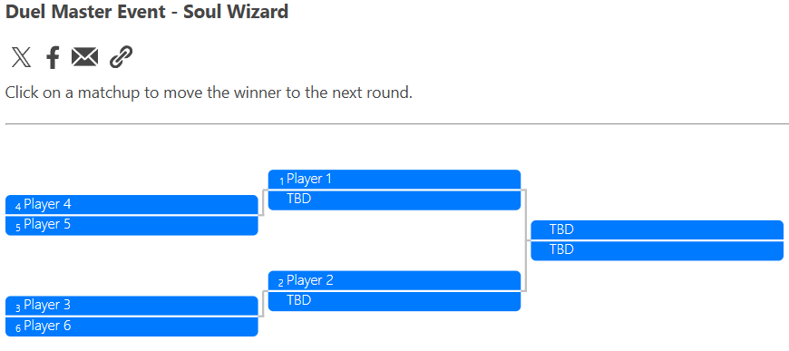 | Our Duel Master (DM) constestants matchup bracket (Single elimination) will now be generated through the link below, you will see the player number in our DM registration list, which is simply the registration number. https://tournamentmgr.com/tournaments/bracket-generator ![]() |